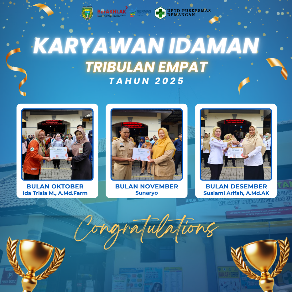 Apresiasi setinggi-tingginya kami berikan kepada para Karyawan Idaman UPTD Puskesmas Demangan Triwulan IV Tahun 2025 yang telah menunjukkan dedikasi, kinerja, dan keteladanan terbaik dalam pelayanan kesehatan ?