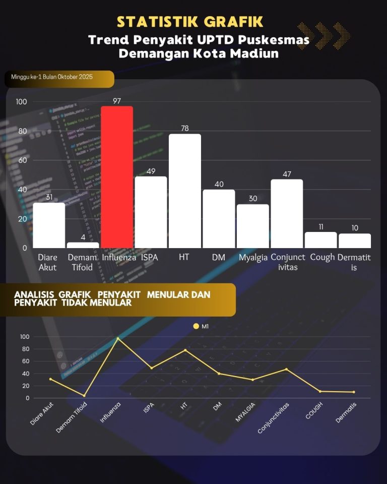 berdasarkan grafik diatas trend kasus terbanyak di minggu ke 1 oktober 2025 adalah influenza sebesar 97 kasus Informasi lebih lanjut:(0351)...