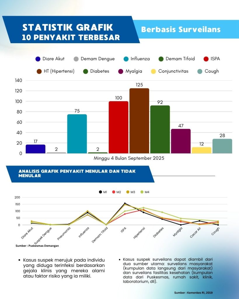 Berdasarkan Grafik Penyakit Menular dan Tidak Menular terendah adalah Suspek Dengue dan Demam Tifoid sebanyak 2 kasus, serta grafik tertinggi pada minggu ke-4 adalah hipertensi sebanyak 125 kasus.