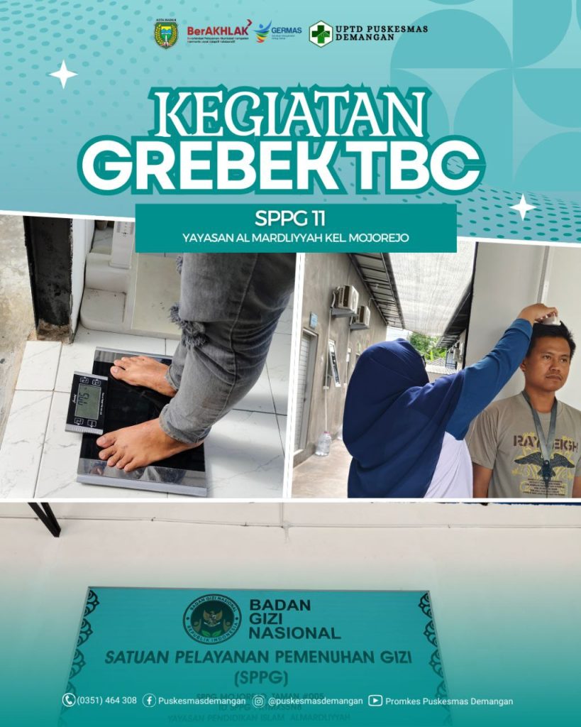 Puskesmas Demangan bersama tim melaksanakan GREBEK TBC di SPPG (Satuan Pelayanan Pemenuhan Gizi) Yayasan Al Mardliyyah Kelurahan Mojorejo. Sejumlah 49 karyawan diperiksa kesehatannya terutama risiko penyakit Tuberkulosis atau TBC