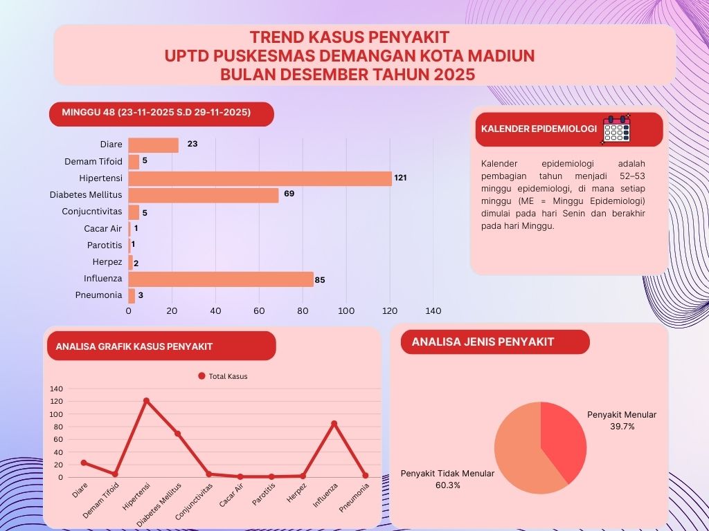 “Tren Kasus Penyakit Minggu ke-48 di UPTD Puskesmas Demangan Kota Madiun. Pemantauan rutin dilakukan untuk mendukung deteksi dini, pencegahan, dan pengendalian penyakit di masyarakat.”