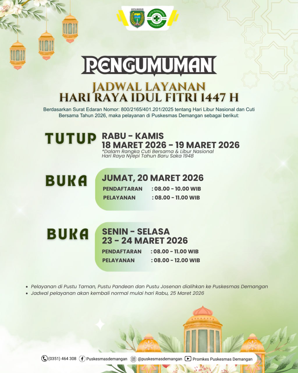 Jadwal Layanan Hari Raya Idul Fitri 1447 H Puskesmas Demangan